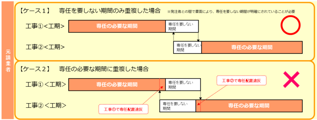 ケース1は配置出来て、ケース2は配置出来ないのであれば結局、専任性が発生する工事は従事出来ない?とお考えになると思いますが、個人的には次のケースでは問題ないと思っています。