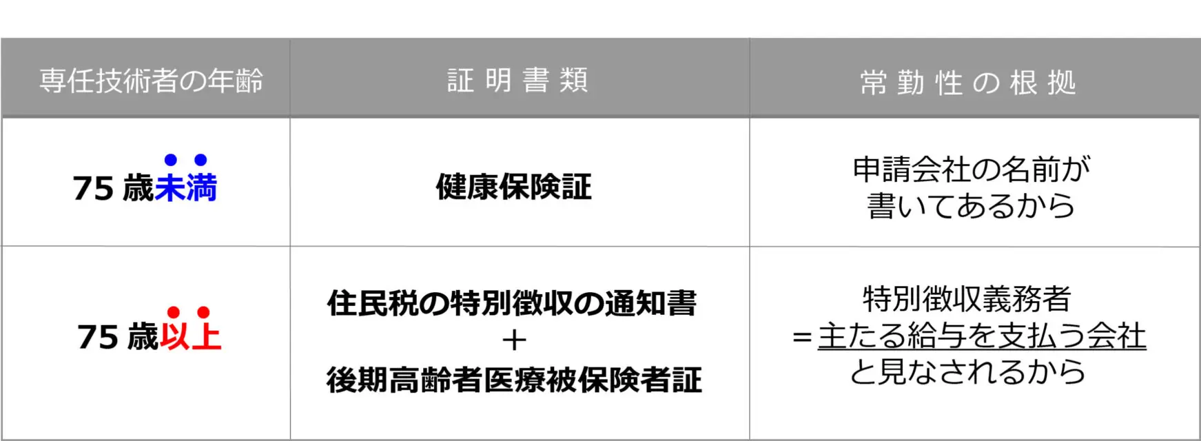 ただし、もし専任技術者が75歳以上の場合であれば、健康保険は後期高齢者医療制度に変わりますので、健康保険証では証明できなくなります。