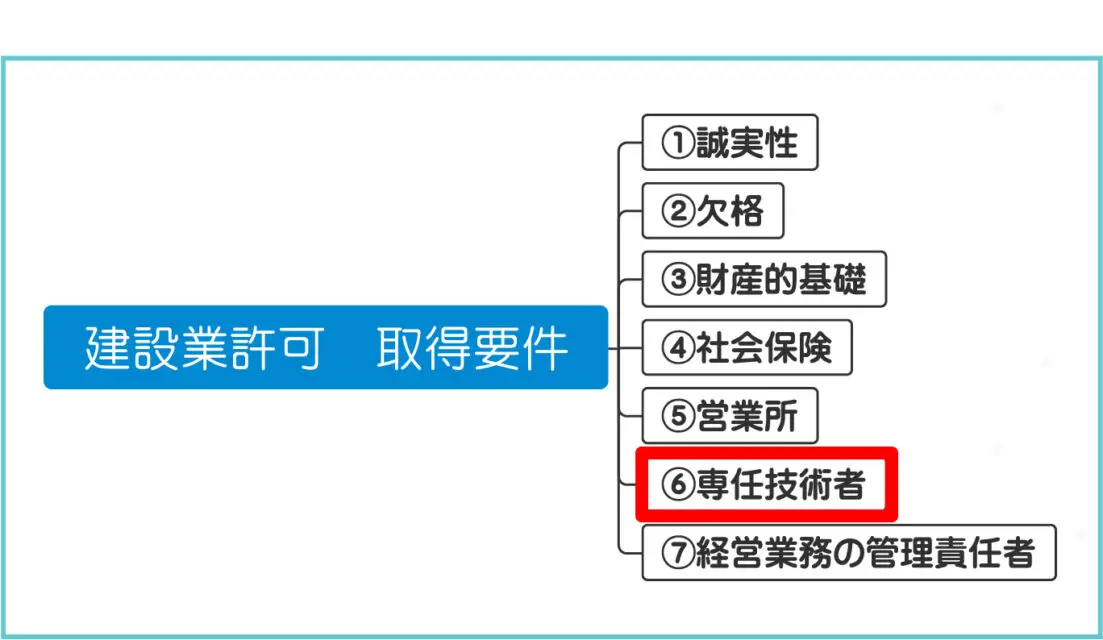専任技術者とは、こちらの図にあるように、建設業の許可要件のうちの1つです。