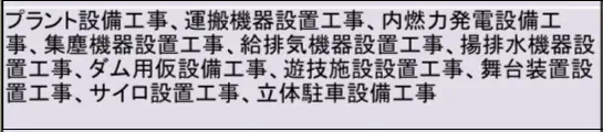 機械器具設置工事業は設備系工事の専門工事のどれにも当てはまらないものという枠組みで判断することがあります。自社が施工した工事が、国土交通省の例示にある機械器具設置工事業の工事名のどれに一番当てはまるかを確認して、ご作成ください。
