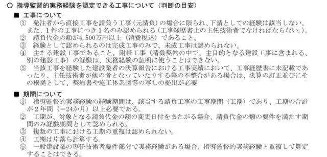 指導監督的実務経験とは施主である発注者から直接請負った元請工事で主任技術者、工事主任、施工監督的などの立場で下請業者に対して工事の技術面を総合的に指導監督した経験です。